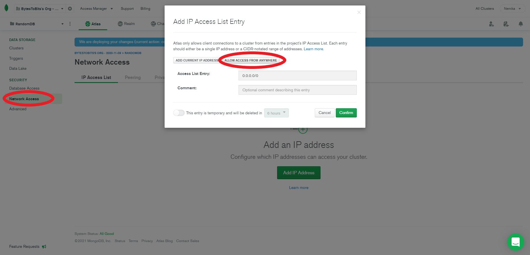 • To allow the bot to actually access the database, you should whitelist all IP's. Go to Network Access section under the Security tab and click + ADD IP ADDRESS. Click the Allow Access From Everywhere and 0.0.0.0/0 should appear in the Whitelist Entry. If it doesn't, enter it manually. Lastly, click confirm. Whitelist All IP's