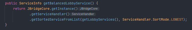 as the first parameter a list with the group of services for the lobby and as the second parameter the sort mode, in this case LOWEST, the algorithm will choose the lobby server with the lowest number of players to balance the lobby servers